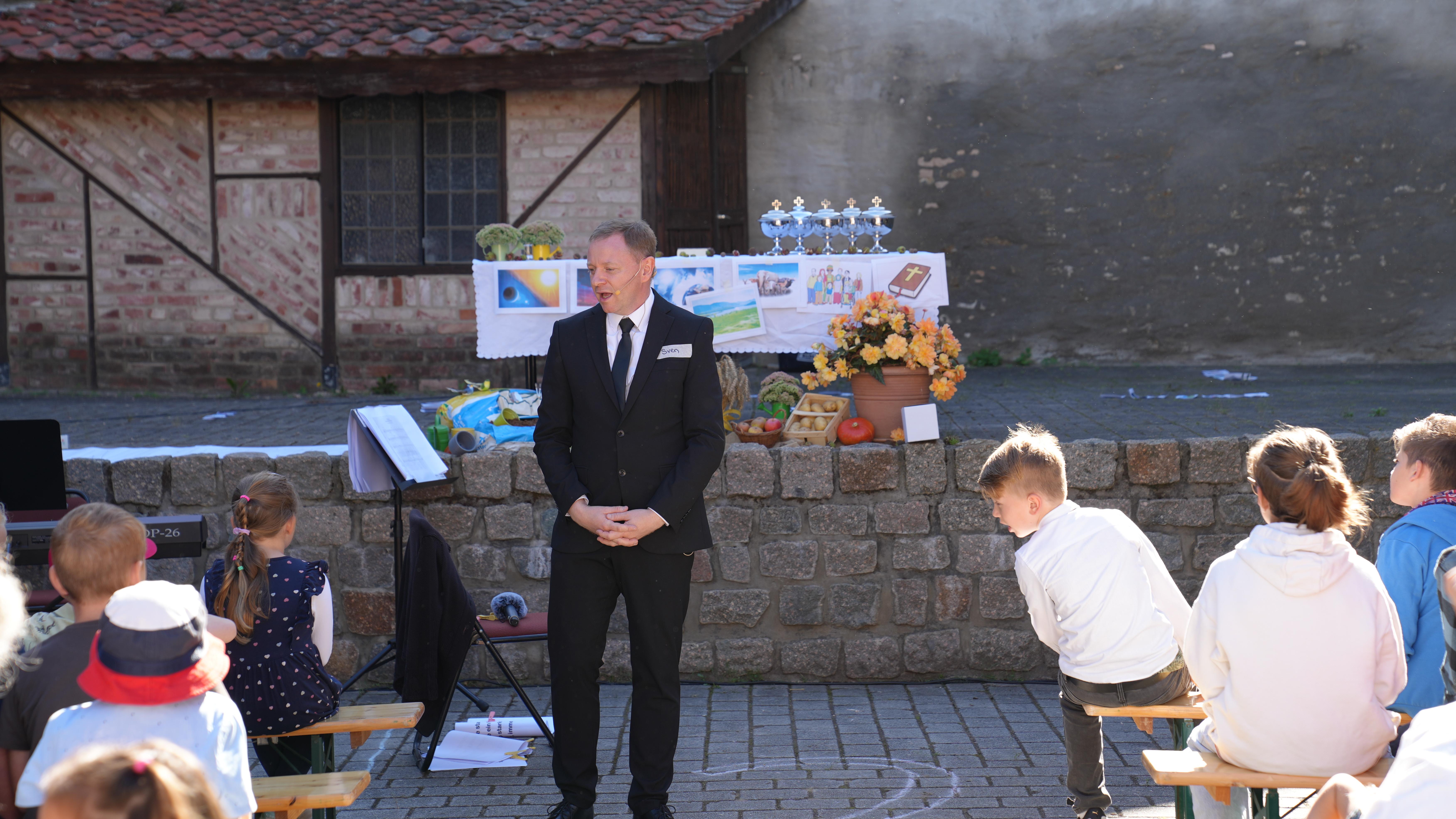 Der Gottesdienst stand unter dem Bibelwort aus 1. Mose 1,31: „Und Gott sah an alles, was er gemacht hatte, und siehe, es war sehr gut.“ Zu Beginn sollten die Kinder herausfinden, wie und in welcher Reihenfolge Gott die Welt geschaffen hat - Licht und Dunkel, Himmel und Erde, Land und Wasser, Sonne, Tiere, Menschen, Bibel (als Zeichen für den Sonntag=Ruhetag) – und als Gott damit fertig war, sagte er: „Es ist alles sehr gut.“ Auch der Abstand Erde-Sonne passt zu 100 Prozent. Wäre er zu gering, wäre es zu warm. Ist er zu groß, ist es zu kalt. Gibt es in der Schöpfung auch Wunder? Ja! Die Hummel ist ein Tier, das fliegen kann, und kein Mensch kann erklären, warum. Der Mensch ist ein absolutes Unikum. Es gibt keinen Menschen auf der Erde, der gleich ist. Jeder hat seine individuellen Fingerabdrücke. Das waren nur einige Beispiele, um die anwesenden Kinder darauf aufmerksam zu machen, was Gott in seiner Schöpfung alles mit einfachen Dingen geschaffen hat.