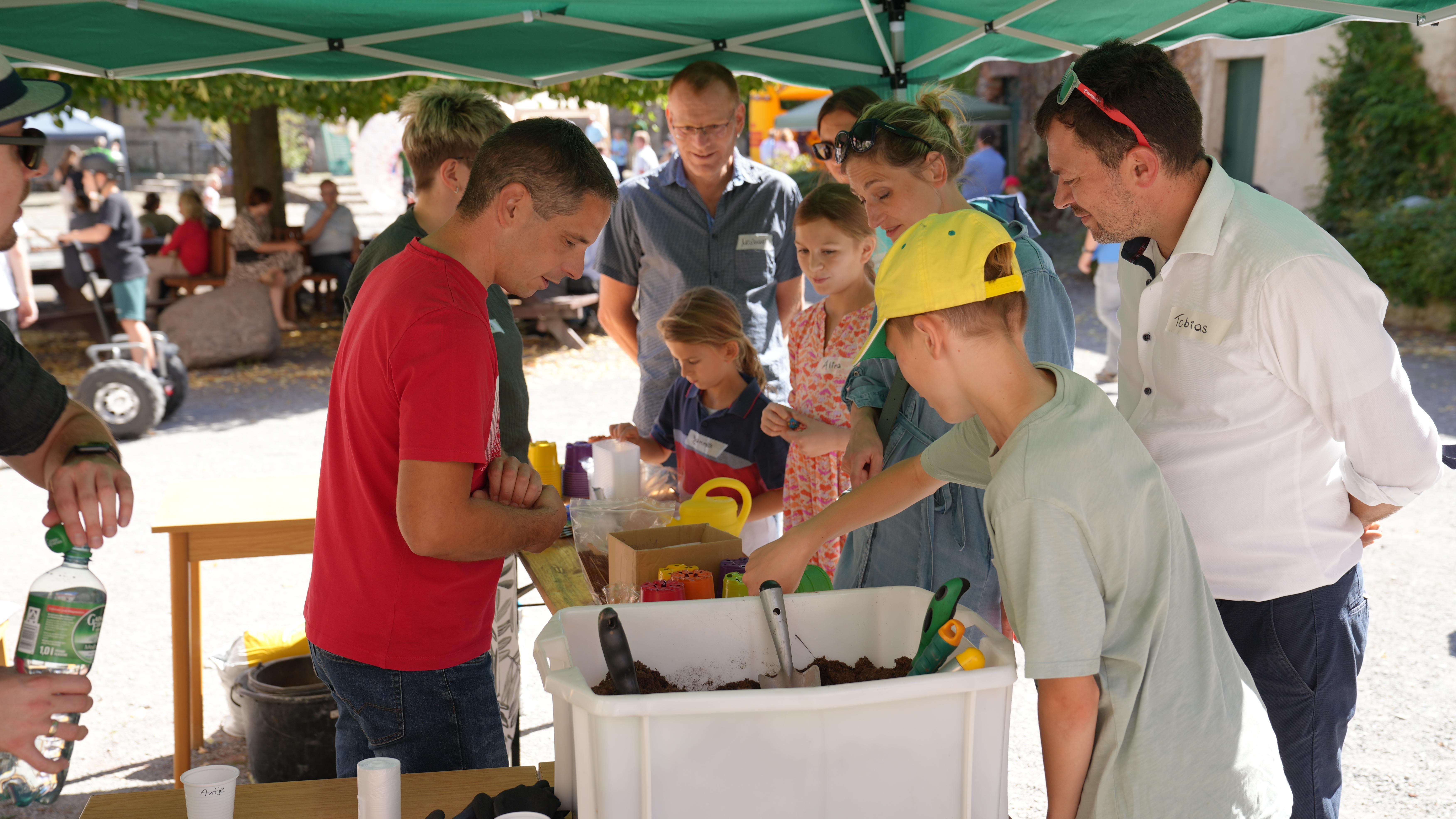 Am Gärtnereistand konnten kleine Blumentöpfe mit Erde gefüllt und Samen ausgesät werden und ein kleines "Gewächshaus" wurde mit Kresse besät. Samen: Kaum vorstellbar, dass darin die Kraft neuen Lebens liegt. Es bedarf Luft, Wasser, Wärme, Pflege und Geduld, dem Samen beim Sprießen und Wachsen zuzusehen. Dies konnten die Kinder ausprobieren und zum Teil noch am gleichen Tag an Hand der ersten gekeimten Samen bestaunen. Ebenso gab es einen kleinen Globus als Schlüsselanhänger und einen Pflanzstecker mit dem Kirndertag-Logo.