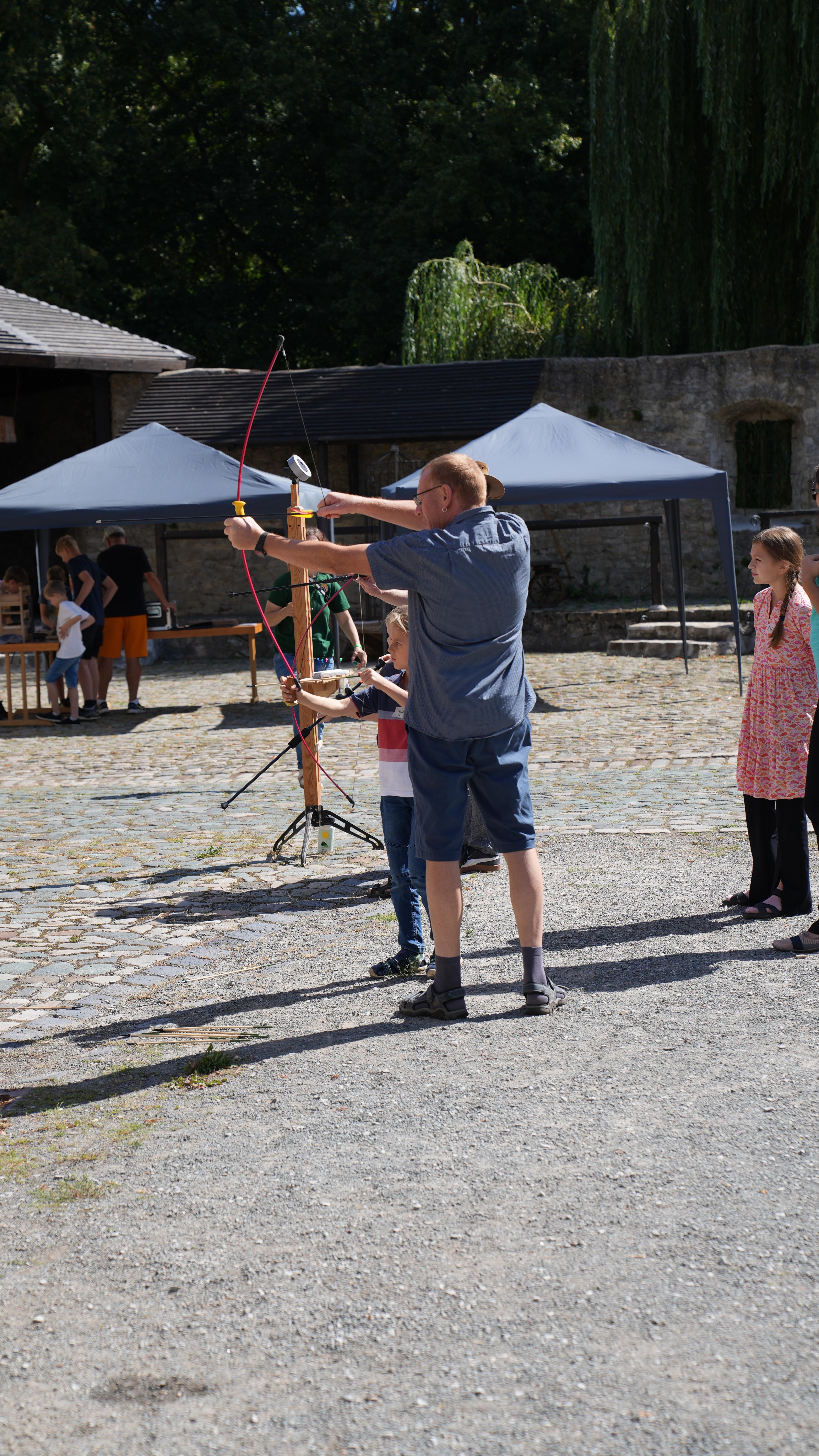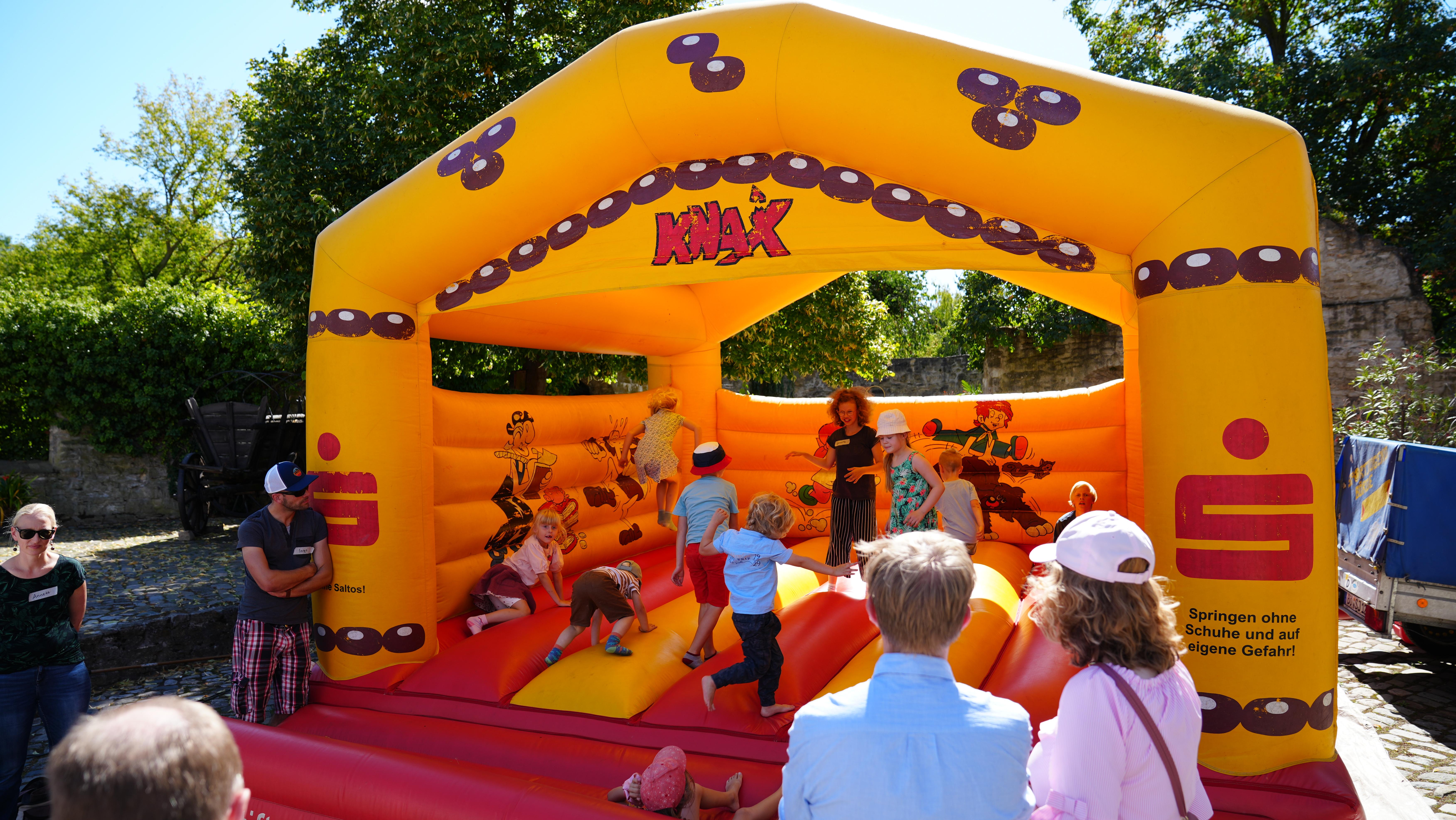 Für die Verpflegung war auch gesorgt. Es gab Nudeln mit Gulasch oder Tomatensauce sowie Kaffee und Kuchen und kalte Getränke. Auf dem Burghof waren mehrere Stände aufgebaut. Ein Gärtnereistand, eine Hüpfburg, Basteln und Kinderschminken sowie Segwayfahren oder der Riesen-Laufball konnten probiert werden.