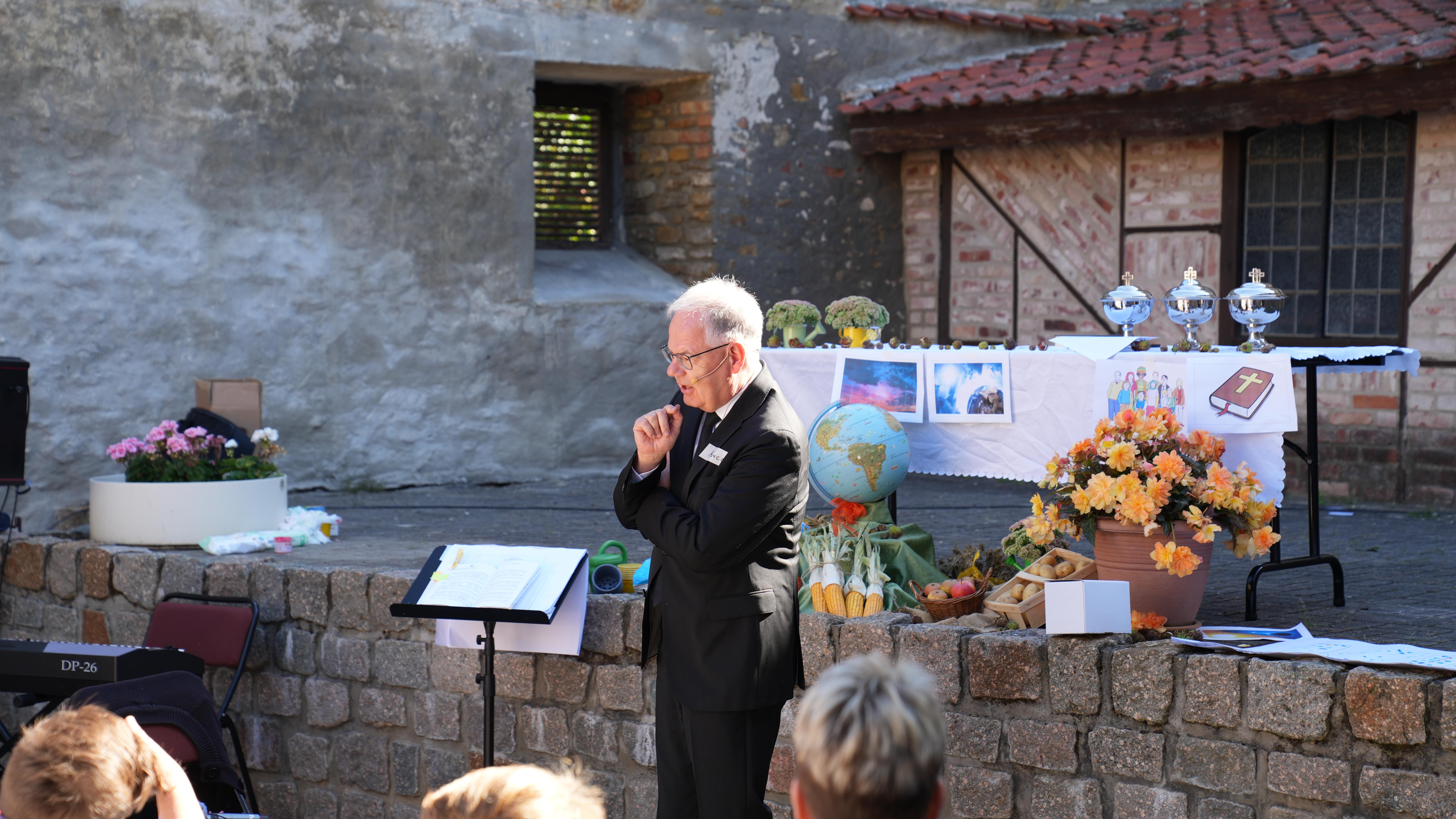 Der Gottesdienst stand unter dem Bibelwort aus 1. Mose 1,31: „Und Gott sah an alles, was er gemacht hatte, und siehe, es war sehr gut.“ Zu Beginn sollten die Kinder herausfinden, wie und in welcher Reihenfolge Gott die Welt geschaffen hat - Licht und Dunkel, Himmel und Erde, Land und Wasser, Sonne, Tiere, Menschen, Bibel (als Zeichen für den Sonntag=Ruhetag) – und als Gott damit fertig war, sagte er: „Es ist alles sehr gut.“ Auch der Abstand Erde-Sonne passt zu 100 Prozent. Wäre er zu gering, wäre es zu warm. Ist er zu groß, ist es zu kalt. Gibt es in der Schöpfung auch Wunder? Ja! Die Hummel ist ein Tier, das fliegen kann, und kein Mensch kann erklären, warum. Der Mensch ist ein absolutes Unikum. Es gibt keinen Menschen auf der Erde, der gleich ist. Jeder hat seine individuellen Fingerabdrücke. Das waren nur einige Beispiele, um die anwesenden Kinder darauf aufmerksam zu machen, was Gott in seiner Schöpfung alles mit einfachen Dingen geschaffen hat.