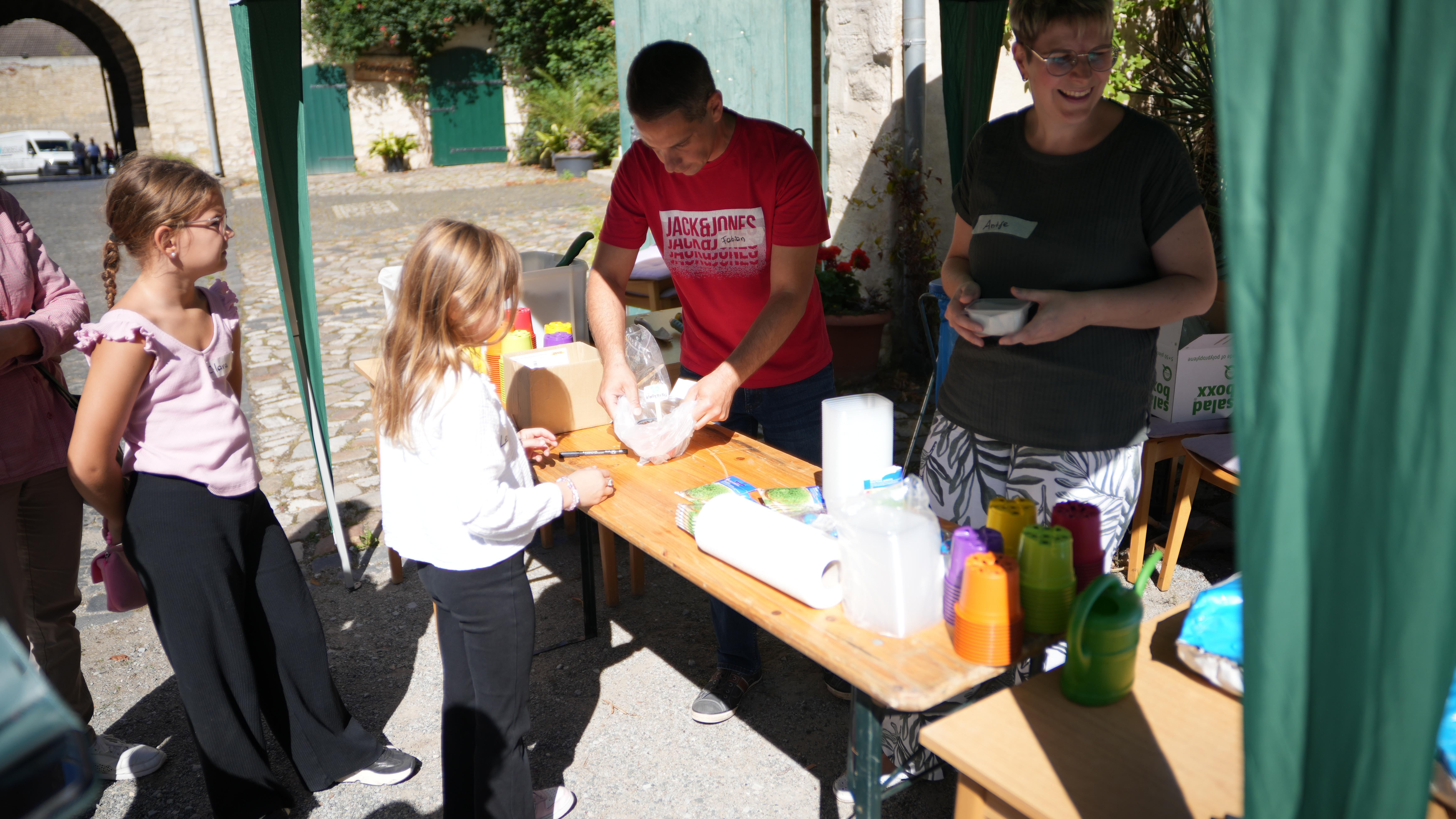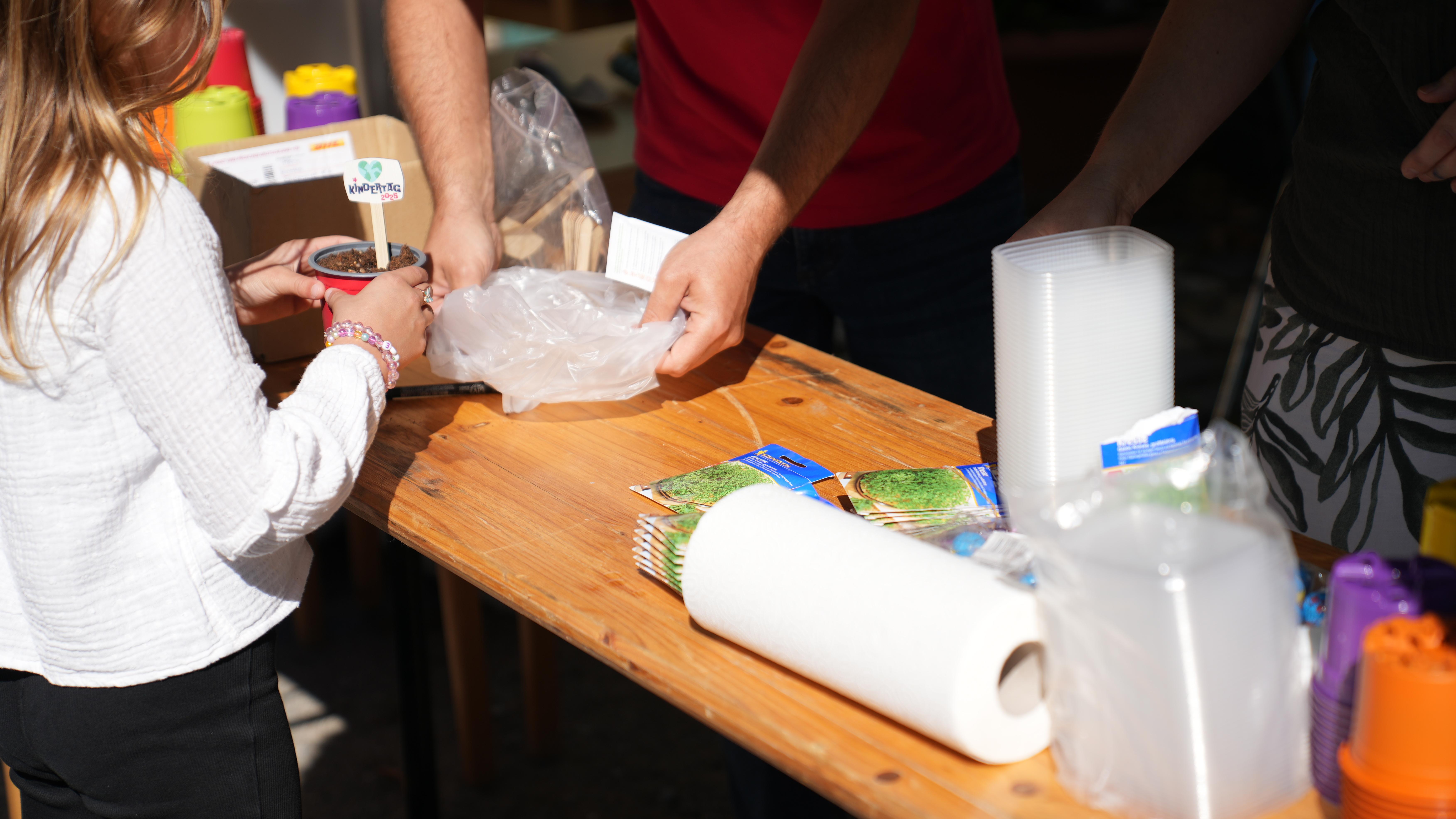 Am Gärtnereistand konnten kleine Blumentöpfe mit Erde gefüllt und Samen ausgesät werden und ein kleines "Gewächshaus" wurde mit Kresse besät. Samen: Kaum vorstellbar, dass darin die Kraft neuen Lebens liegt. Es bedarf Luft, Wasser, Wärme, Pflege und Geduld, dem Samen beim Sprießen und Wachsen zuzusehen. Dies konnten die Kinder ausprobieren und zum Teil noch am gleichen Tag an Hand der ersten gekeimten Samen bestaunen. Ebenso gab es einen kleinen Globus als Schlüsselanhänger und einen Pflanzstecker mit dem Kirndertag-Logo.
